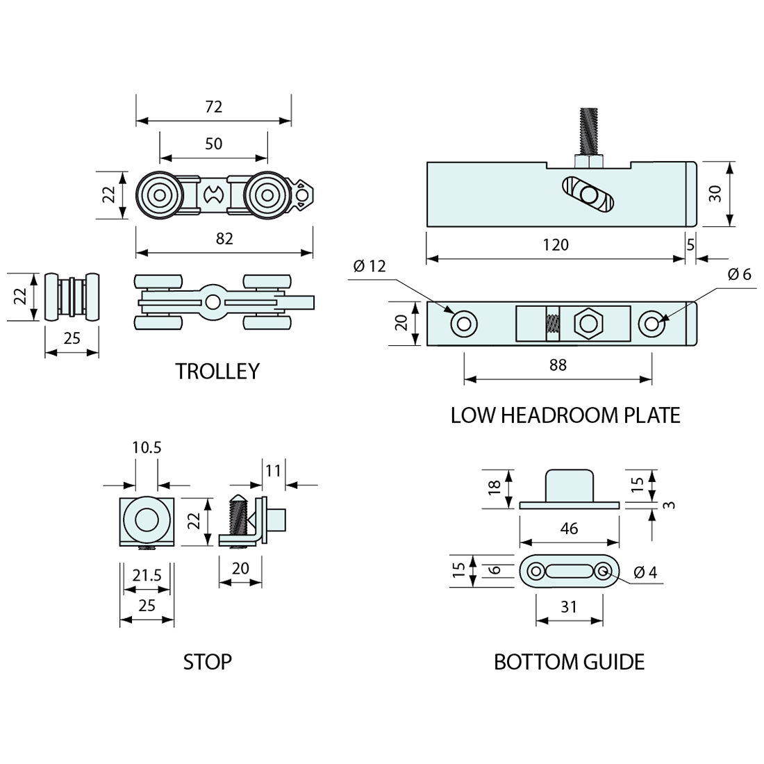 • Kit Includes: 2 x Low Headroom Plate, 2x Four Wheel Trolley, 2x Stop and 1x Bottom Guide